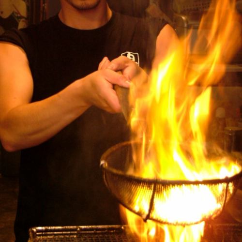 さつま知覧どりを焼師が豪快に炎で炙る姿は迫力満点です!口に入れた途端、炭火焼の良い香りが広がります。