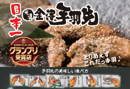 鳥珍やと言えば「金澤手羽先」!全店舗にてご注文率No.1。癖になる1品。